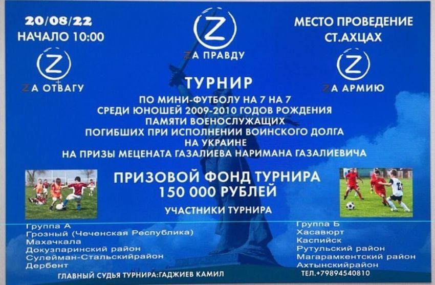 20 августа в 10:00 в Ахты пройдет турнир по мини-футболу 7 на 7 среди юношей 2009-2010 годов рождения памяти военнослужащих, погибших при исполнении воинского долга на Украине на призы мецената Газалиева Наримана Газалиевича. Призовой фонд — 150 000 рублей.
